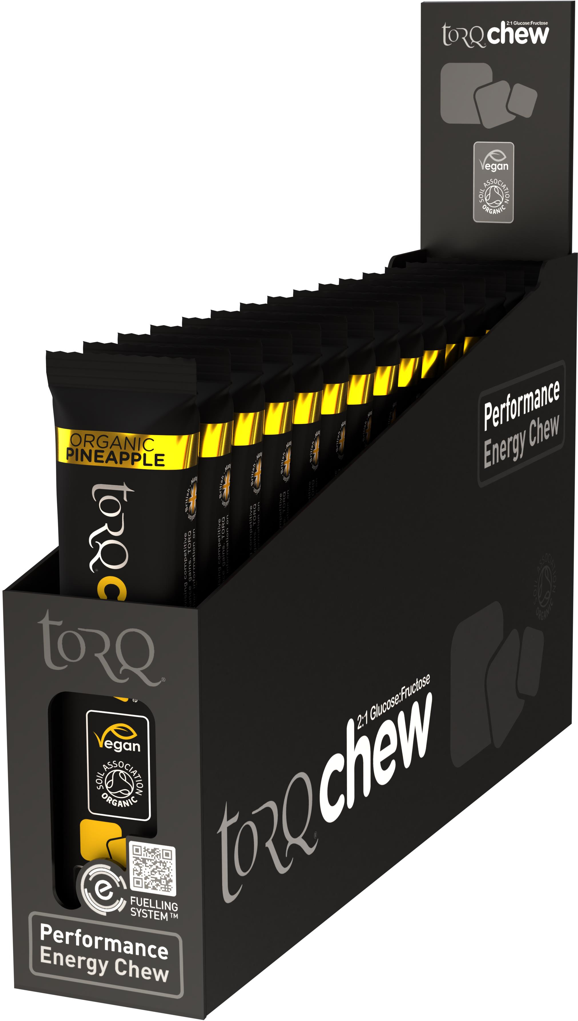 TORQ: The TORQ Chew has the texture and flavour of chewy confectionary, yet the formulation is certified 100% Organic by the Soil Association, so as ever, nutritional purity is at the top of the TORQ agenda.TORQ Chew forms part of the TORQ Fuelling System, so can be used alongside TORQ’s energy drinks, gels and bars to fuel optimal performances.TORQ Chew is produced with only 4 cold-pressed organic ingredients and contains 30g of 2:1 multiple-transportable carbohydrates. With nothing artificial, and barely any fat. Gluten-free and suitable for vegans.1 TORQ Chew = 1 TORQ Unit(See TORQ Fuelling System)